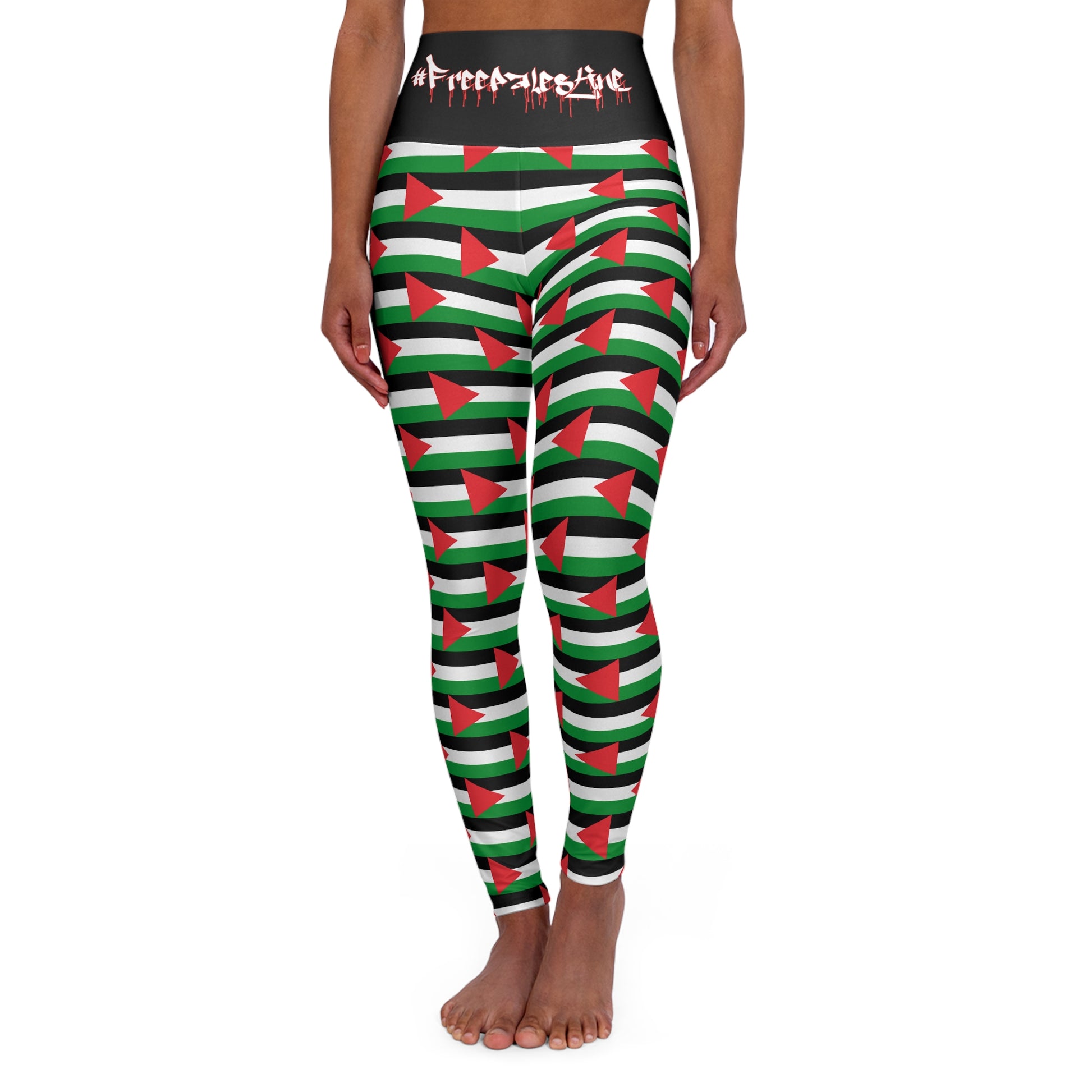 Vibrant and stylish high waisted yoga leggings designed by KrazyBaby425 using her Free Palestine Design. Perfect for workouts and running errands, these leggings offer a skinny fit and a comfortable 4.5" waist. Ideal for fitness enthusiasts and fashion-forward individuals. Relevant for yoga classes, gym sessions, and casual outings.